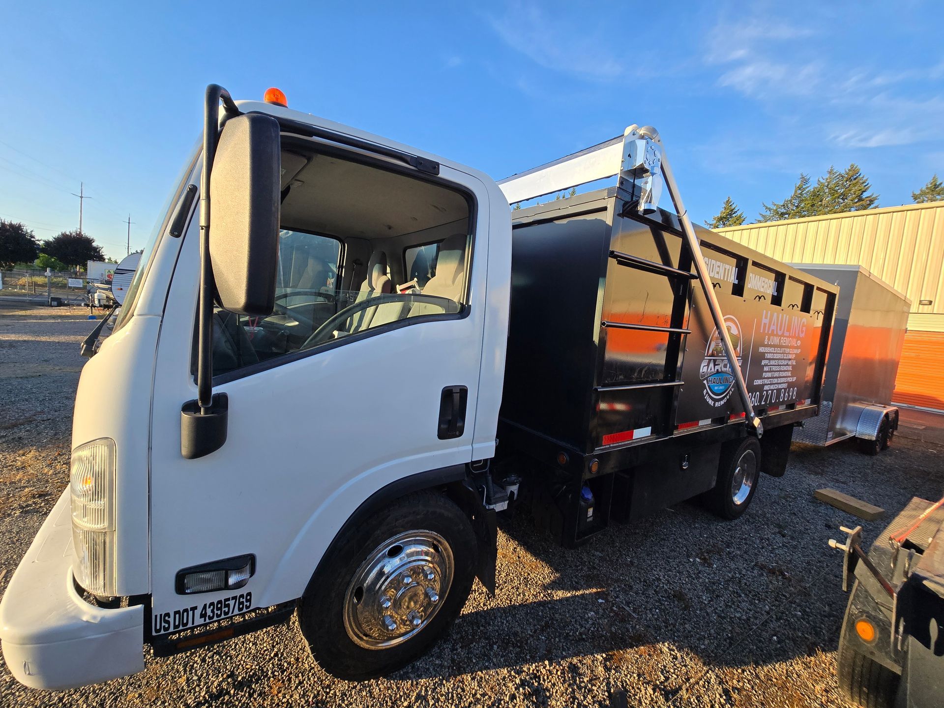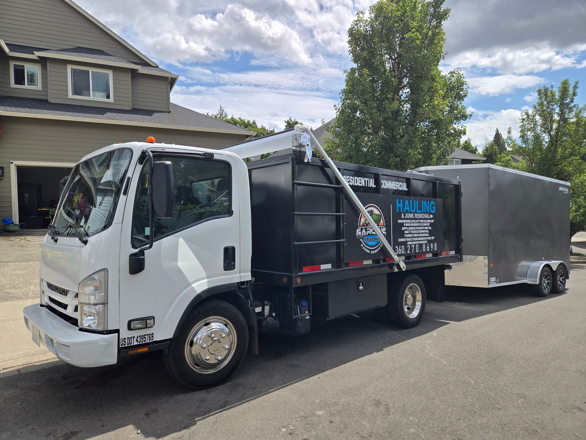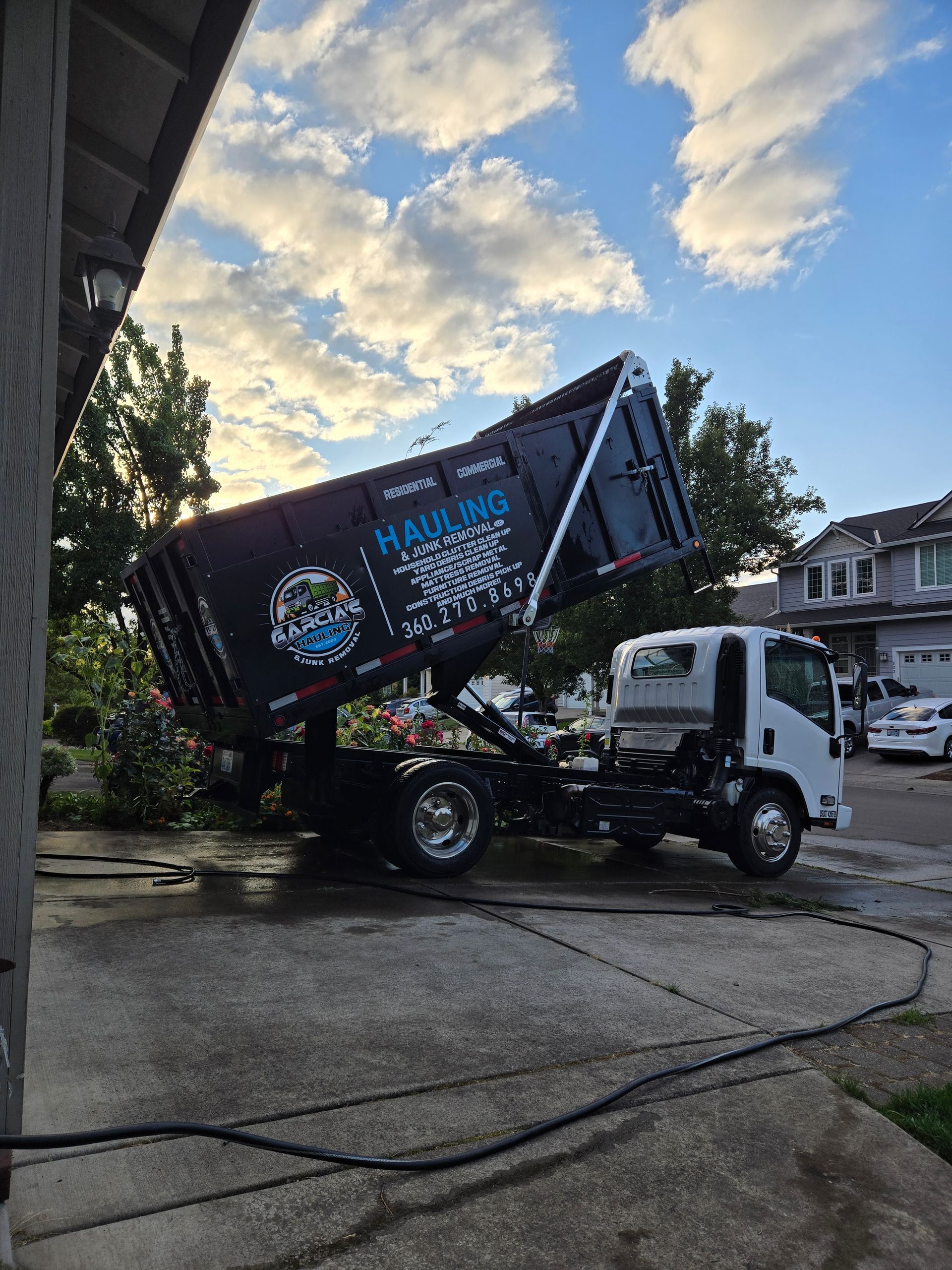 Truck and trailer on a residential street, Garcia's hauling junk. Dusk.