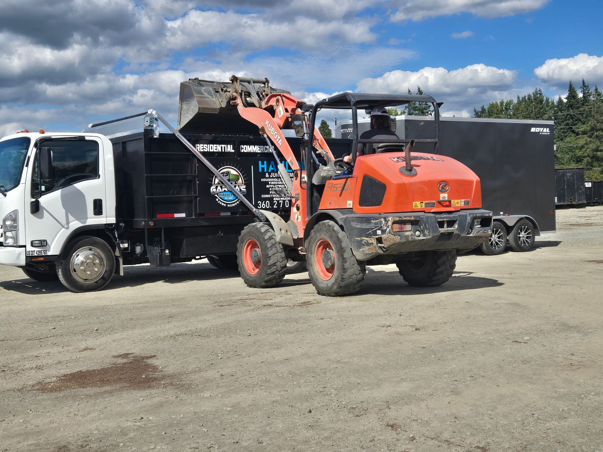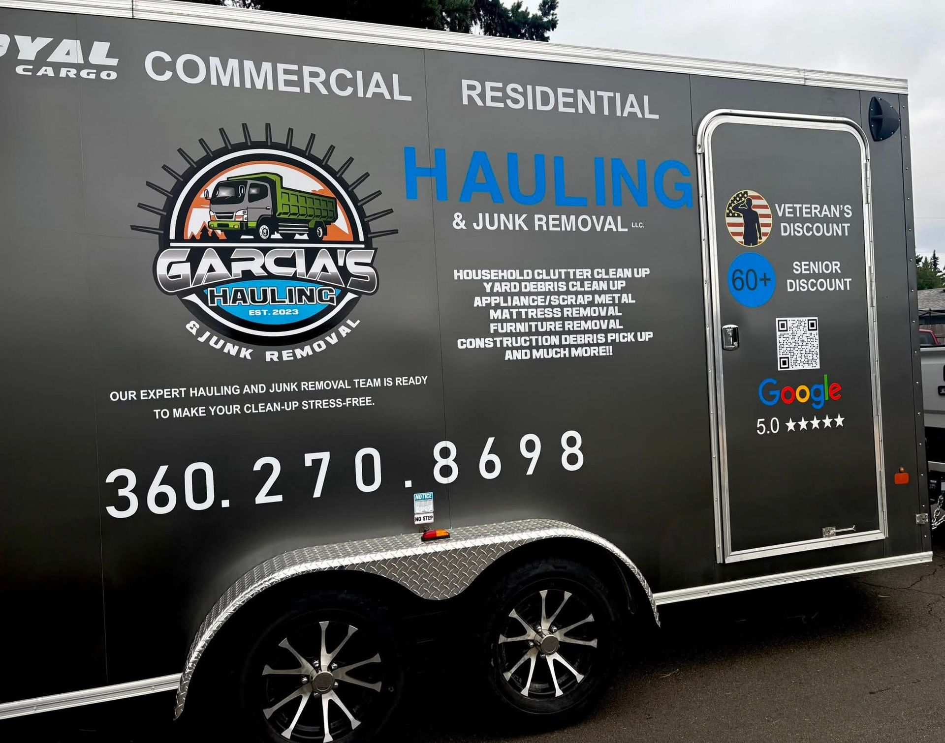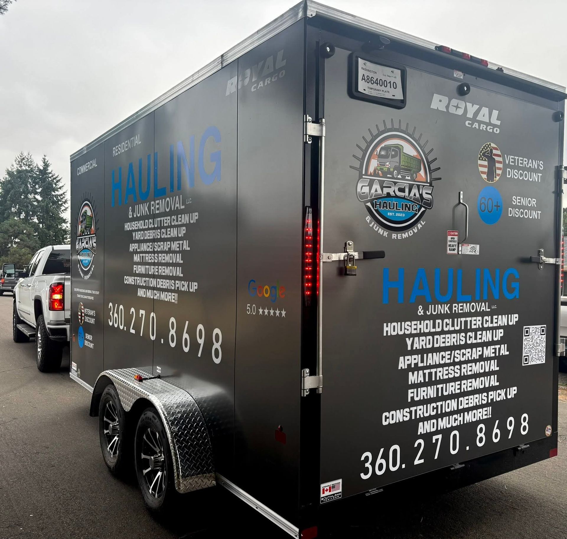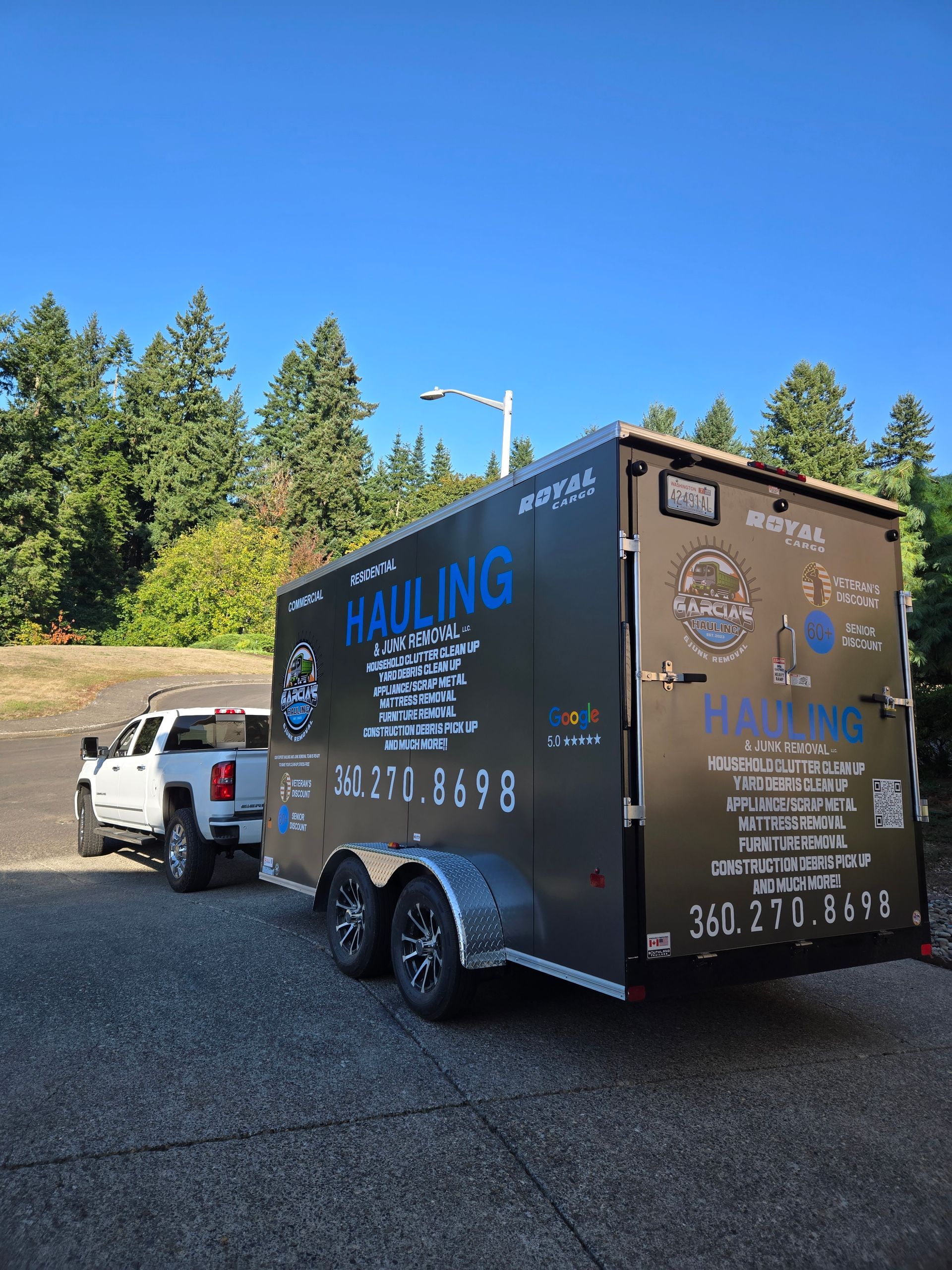 Grey pickup truck with trailer at a recycling center, Garcia's Hauling logo on the truck.