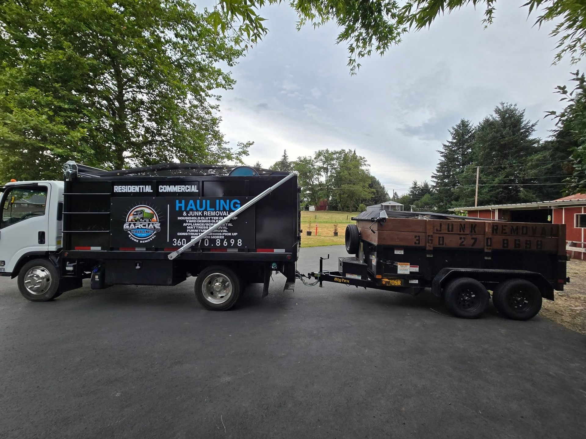 A black truck loaded with junk, the sign Garcia's Hauling & Junk Removal is displayed. A blue car is on the left.